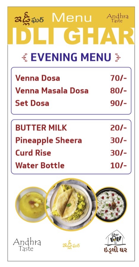 The welcoming atmosphere and prompt service enhance your dining experience. Whether it's a quick takeaway or a leisurely meal, Idli Ghar promises a satisfying taste of Andhra tradition with every bite.